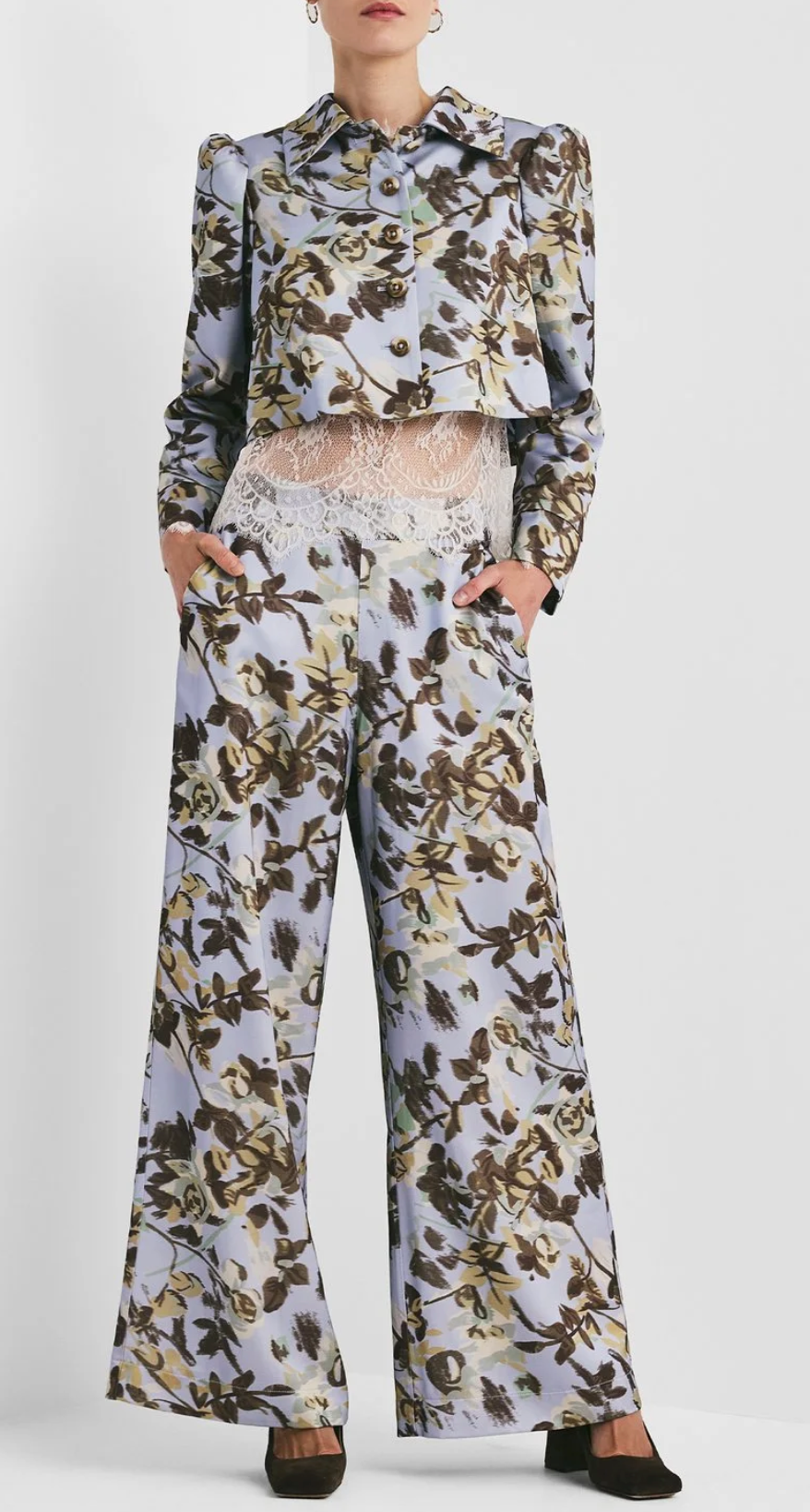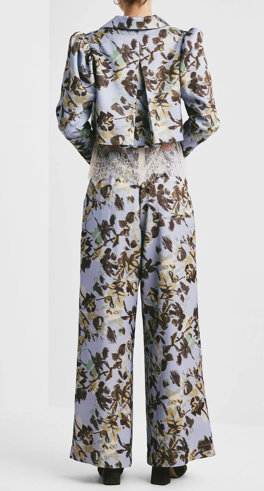 The trousers has a flared and sculptural silhouette with elastic at the back waistband and side pockets.