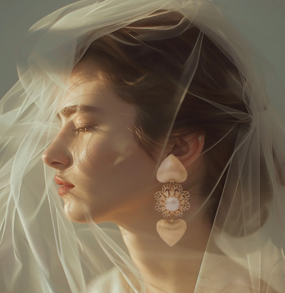Large and lightweight heart charms frame a single large pearl floral bloom.