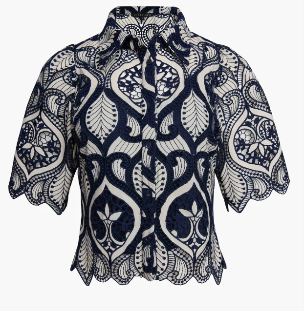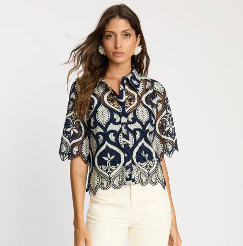 A classic collar and full button-down front lend polished structure to the silhouette, balancing the softness of the lace with refined tailoring. Short, slightly flared sleeves add a graceful, feminine touch, while the relaxed fit drapes beautifully for effortless styling. Whether paired with denim for a chic daytime look or styled with tailored pieces for a more elevated ensemble, the Tay Top offers timeless sophistication with modern ease.