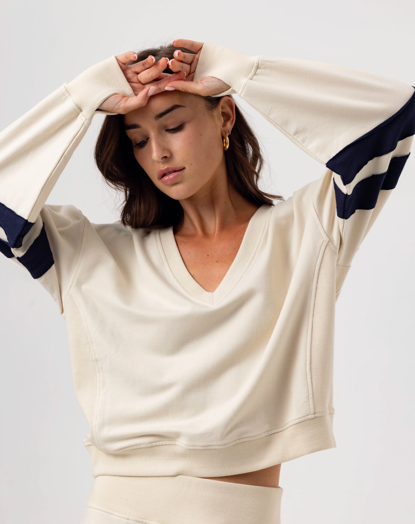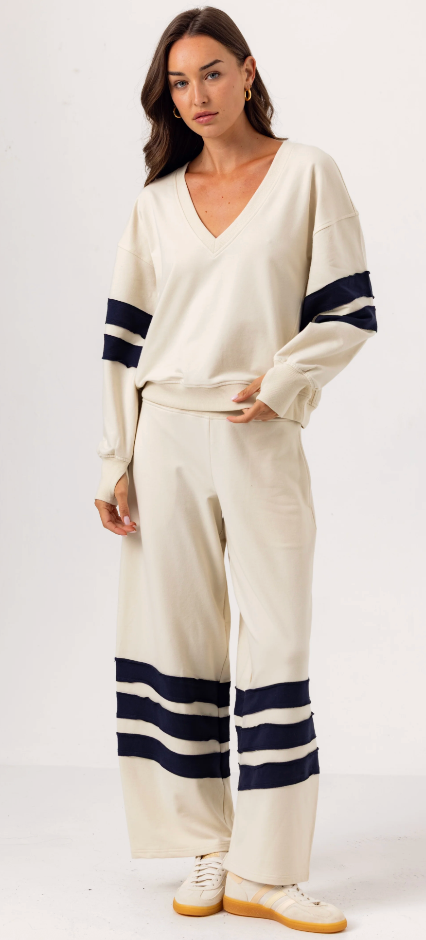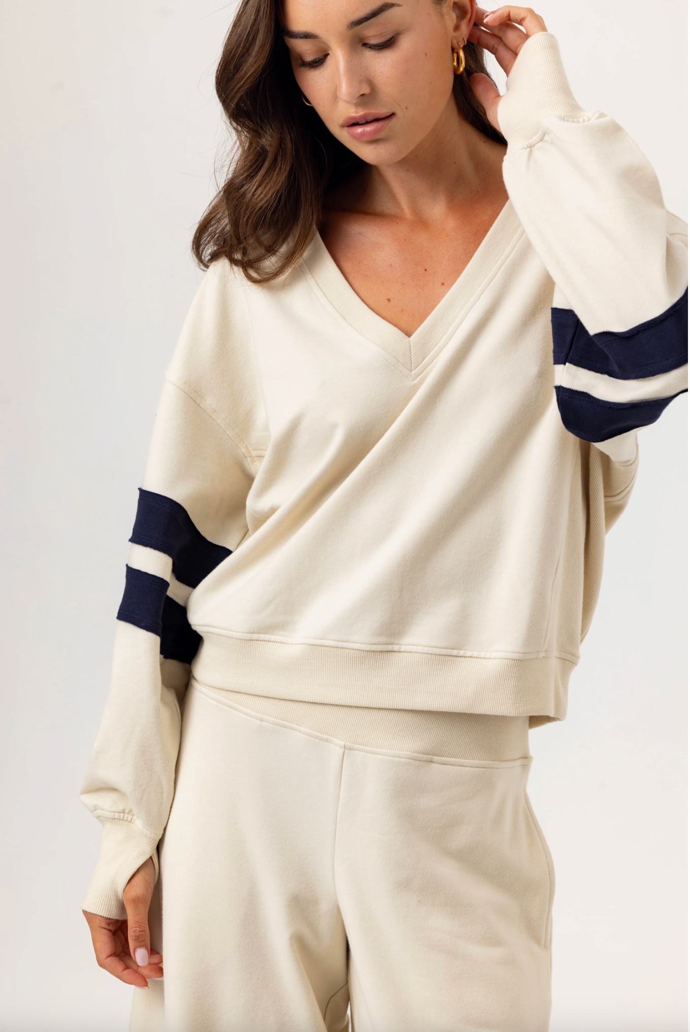 It features a deep V-neck and full-length sleeves complete with functional thumbholes. The Winslow is designed with sewn-on rugby stripes that provide layered depth and dimension to the piece. Winslow's silhouette measures 23 inches on size small, hitting perfectly atop the matching Thorne pants.